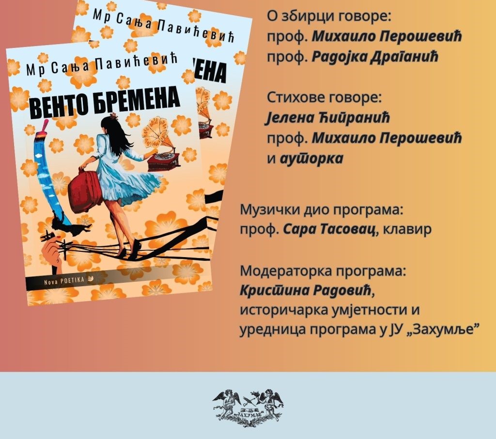 Јавна установа „Захумље“ позива све љубитеље поезије и умјетности на промоцију збирке поезије „Венто бремена“ ауторке мр Сање Павићевић, која ће се одржати у уторак, 21. октобра 2025. године, у 19 часова, у Сали „Захумља“.