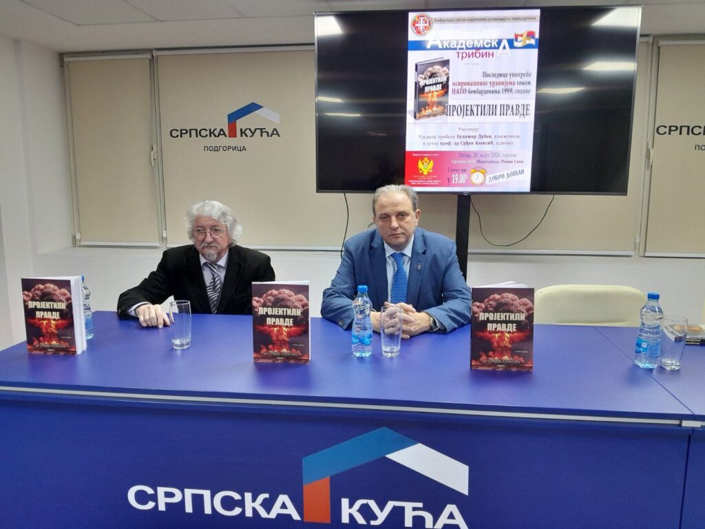 Академска трибина“Последице употребе осиромашеног уранијума током НАТО бомбардовања 1999. године – Пројектили правде“ аутора доктора професора Срђан Алексић , адвокат из Ниша, вечерас је одржана у Српској кући у Подгорици. Срђан Алексић, адвокат и доктор правних наука из Ниша, аутор књиге „Пројектили правде“ и оснивач је адвокатске канцеларије у Нишу која готово три деценије заступа грађане у предметима заштите људских права и накнаде штете.