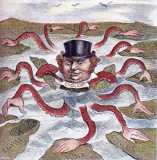 An American cartoonist in 1888 depicted John Bull (England) as the octopus of imperialism, grabbing land on every continent.